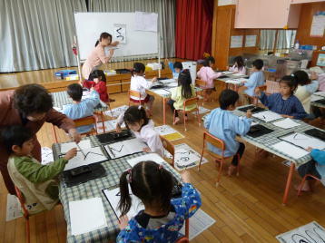 毎日書道会審査会員・静岡県書道教授会理事長であり書道研究群鴎社の加藤秋濤先生・瑞祥先生・春彩先生たちのご指導を仰ぎ、週一回行います。言葉への興味や関心を育て、喜んで話したり聞いたりする態度や豊かな言葉が身に付くように、きびしい中にも楽しくやさしく無理のないように指導していただいております。