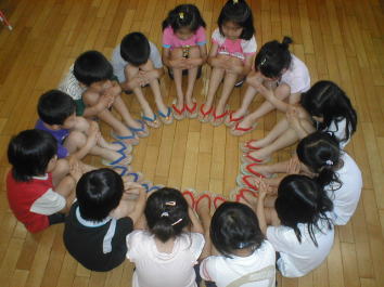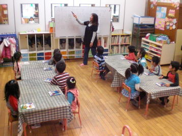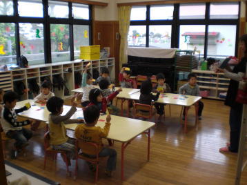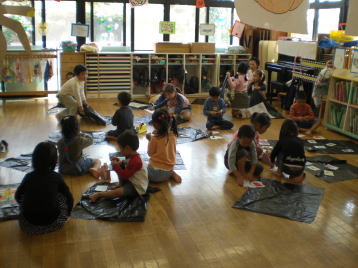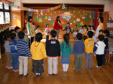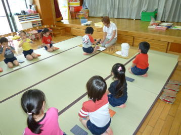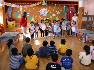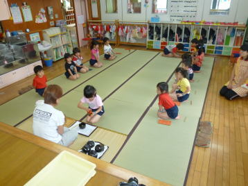 株式会社ソピック英会話講師・稲田昌子先生のご指導で、月二回行います。ゲームや歌を通じて、楽しい雰囲気のあそびの中で色々な挨拶や単語等が自然に身につき、”英語って楽しいな・・・”大好きになれるように指導いただいています。