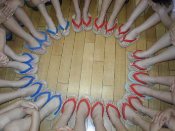 土ふまずを構成している7つの足根骨のうちの、最後の船状骨が化骨するのが5歳頃であり就学までには土ふまずは形成されるものと考えられています。鼻緒をはさんで歩くと立位姿勢のバランスを保持し指の働きが良くなり転倒や怪我が少なくなります。又、土ふまずが促進され、かかより指の部分が広くなって重心がつま先よりになり姿勢が良くなります。足指と足裏への適度な刺激は、第2の心臓といわれる足を伝わり、脳への刺激を与え脳の働きをイキイキとさせます。又発汗によるムレからの悪臭湿疹を防ぎ、足への衛生を保ちます。健康な体作りの一つになっています。