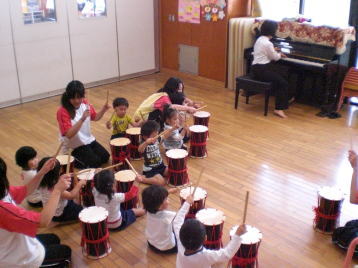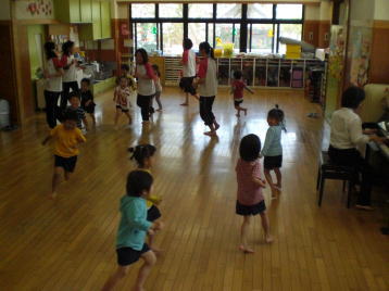 子どもの夢と未来舎代表・佐藤節子先生のご指導で、月1回行います。牛乳パックで作ったリズム積木、水道ホースで作ったフープ等「自分の身近なところから保育材料を見つけ活用しよう」をテーマに体いっぱい使ってのリズムあそび、リトミックあそび、手あそび等、リズムが大好きになれるように楽しみながら教えていただいています。