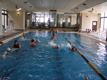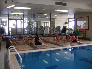 株式会社エンゼルのご支援と(財)日本水泳連盟・(財)日本体育協会公認指導員シャトースイミングクラブ山科祐子代表のもと、石渡誠コーチのご指導で温水プールを使用し年間を通じて体力づくりの一環として行います。4歳児は水に慣れることが第一です。慣れてきたところでビート板やヘルパーをつけ、大きいプールで泳ぎます。卒園する頃には、15mをクロールで泳げることを目標にしています。